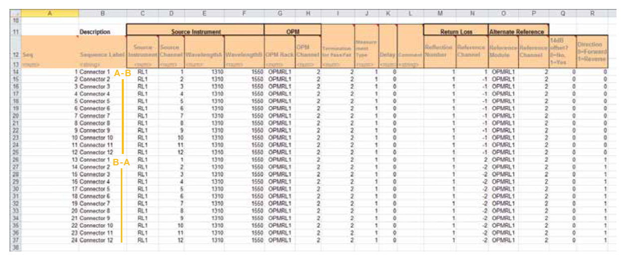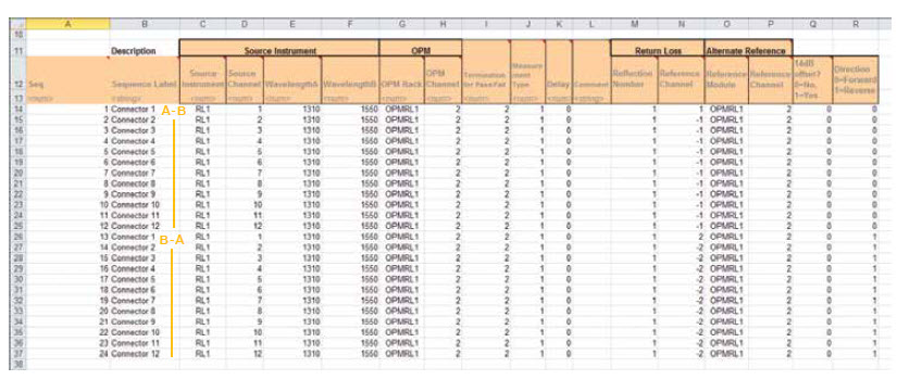 Так как нет гарантии, что расстояние, на котором были проведены измерения RL при установке эталонного значения будет тем же для обоих направлений, Столбец N определяет направление (см. выше). Значения “1” для первого канала в прямом направлении (из порта A-B) и “-1” для оставшихся каналов в этом же направлении позволят скопировать эталонное значение RL с первого канала во все каналы прямого направления. Аналогично, для каналов в обратном направлении значения “2” и “-2” (из порта B-A) будут иметь тот же эффект. Однако допустимо, что эти каналы могут быть измерены отдельно от каналов в прямом направлении.