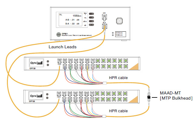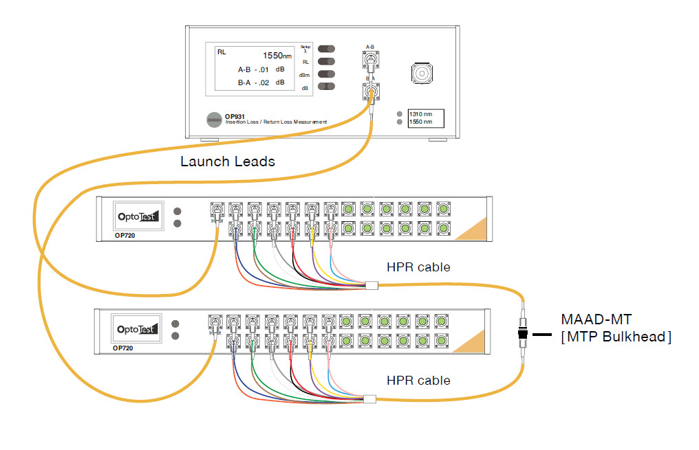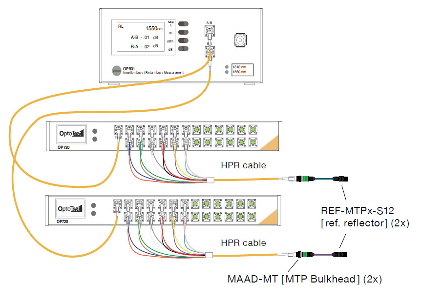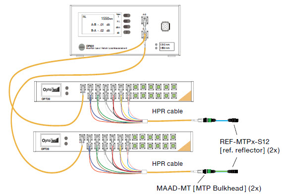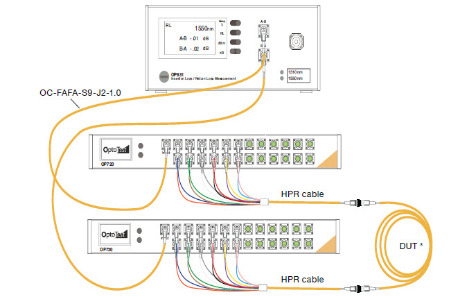 Во время проведение тестов для двунаправленного измерения IL и RL OP931 подсоединяется к входам каждого из OP720. С одной стороны высококачественные эталонные измерительные шнуры соединяются с выводами OP720 (до 144 каналов), и подсоединяются к коннекторам тестируемого шнура (DUT) – с другой стороны таким образом, что DUT расположен между этими эталонными шнурами (симплексный DUT используется, чтобы уменьшить сложность иллюстрации)